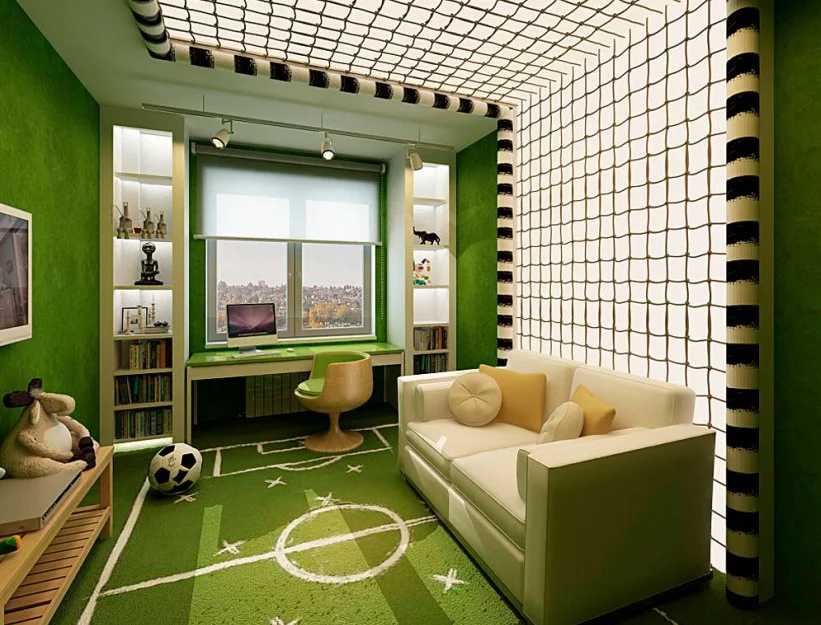 Зеленая комната для мальчика до 12 лет может быть оформлена тематически — хижина в джунглях, элементы футбольных атрибутов или фрагменты парка Юрского периода.