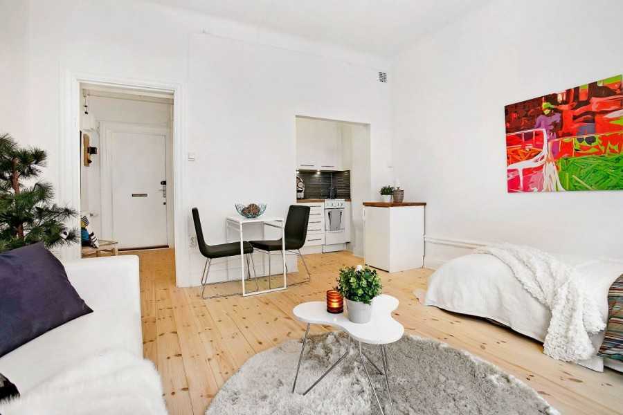 Дизайн малогабаритной, но очень уютной квартиры можно наблюдать в городе Стокгольм. Столовая и спальня расположены в одном пространстве. Ниша рядом с кухней позволяет уместить в ней кровать. Конец коридора был преобразован в современный гардероб, где располагается большой шкаф.