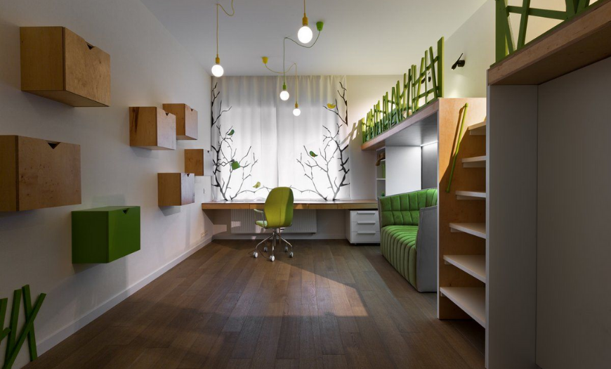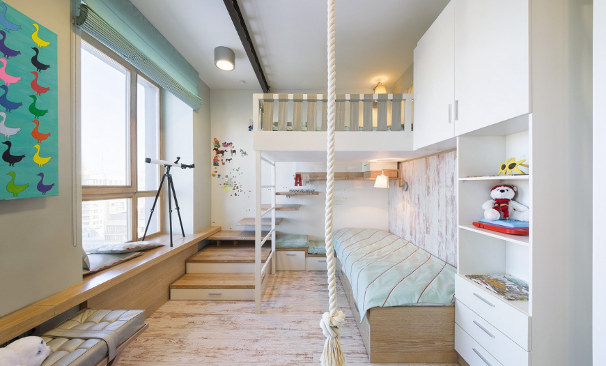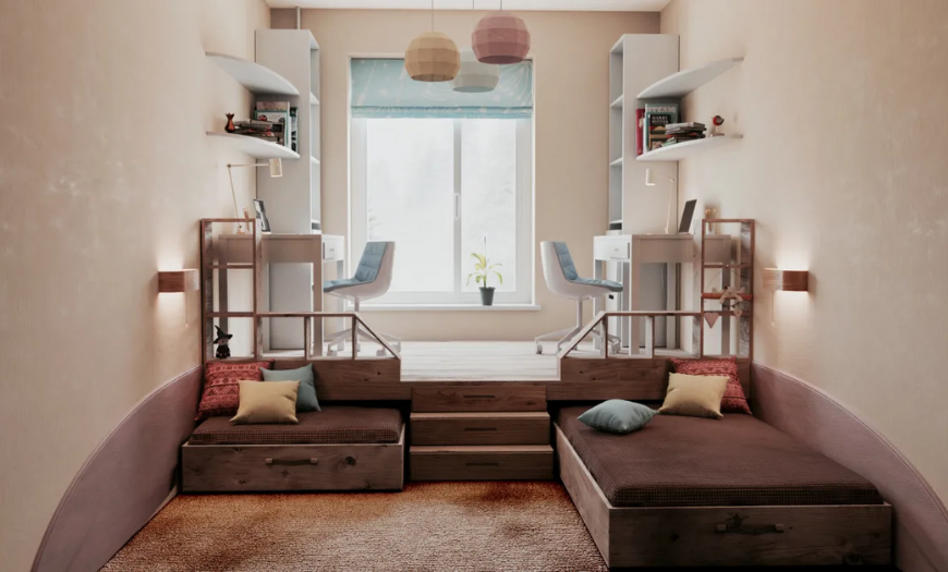Помещение можно разделить на учебно-игровую и спальную с помощью ширм, мобильных перегородок или невысокого подиума. Из мебели для узких комнат подойдут трансформеры, экономящие пространство.