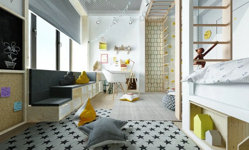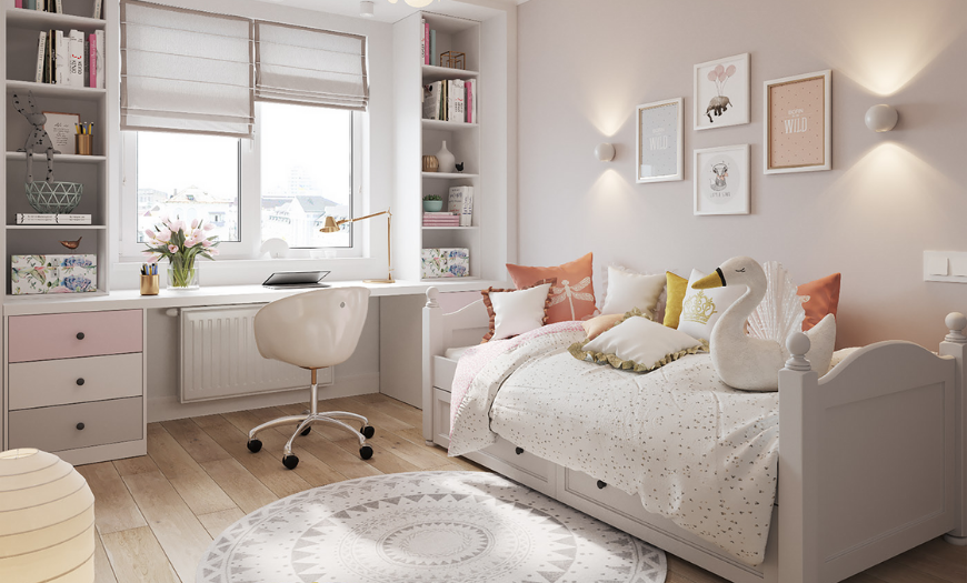 Основная прелесть стиля – отсутствие лишней мебели и аксессуаров. Отлично подходят трансформирующиеся конструкции, которые экономят пространство. Для малышей допускается сочетать простоту с яркими деталями, использовать «сочный» декор.