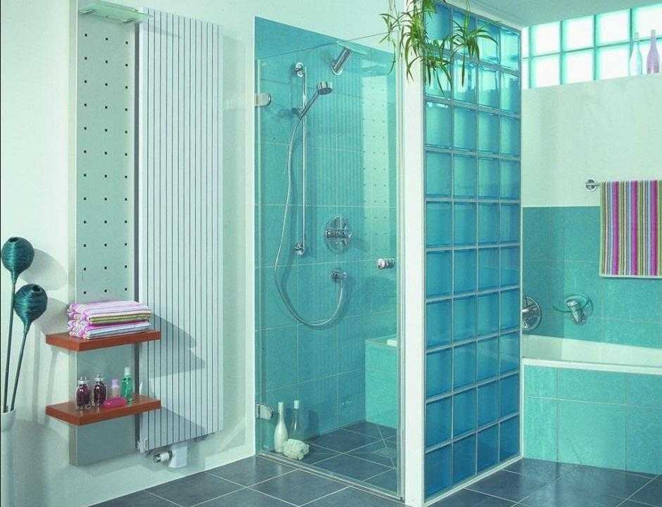 Если необходимо разделить помещение ванной на несколько изолированных секторов, но при этом сохранить ощущение свободного пространства, и создать необычный интерьер, то возможно использовать перегородки из стеклоблоков в ванной. Их форма бывает прямой либо изогнутой в зависимости от желания заказчика и параметров ванной, в которой они будут устанавливаться. Возводить прямые перегородки проще, чем полукруглые. Для создания поворотных конструкций используют угловые элементы.