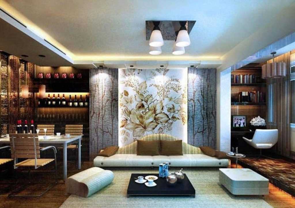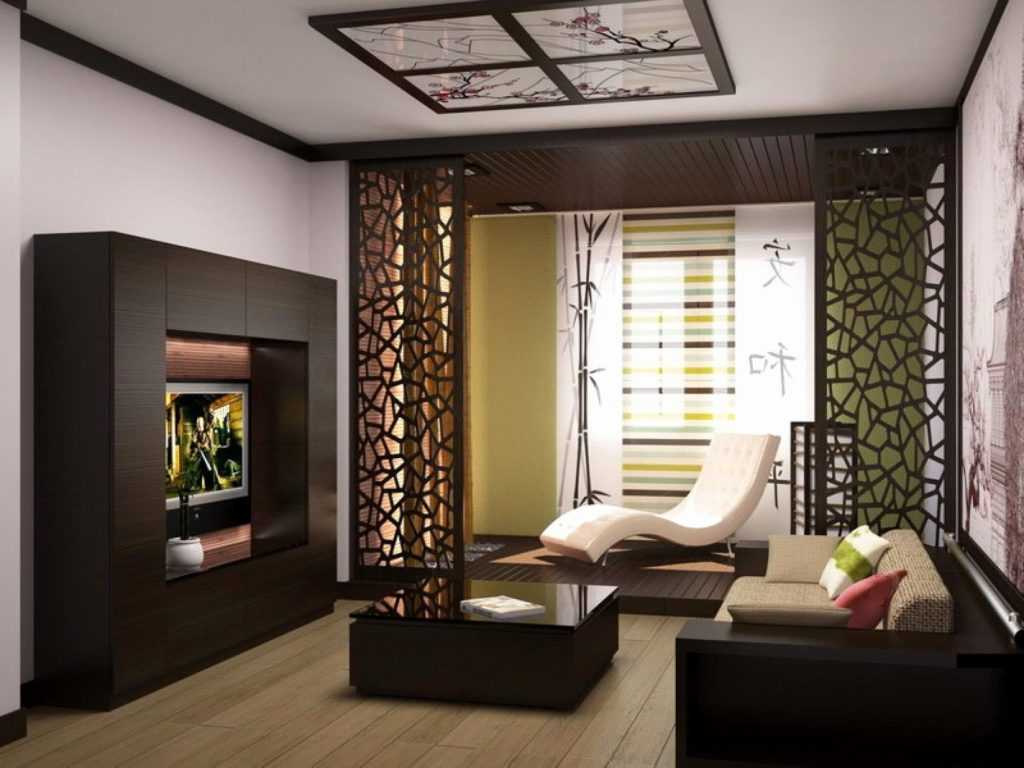 Гостиная, отдекорированная в соответствии с японским стилем, подходит людям, интересующимися восточными культурами и экзотическими интерьерами. Японский колорит в интерьере выглядит ярко и богато, в гостиной будет интересно как проводить время с друзьями, так и спокойно отдыхать, читая книги.