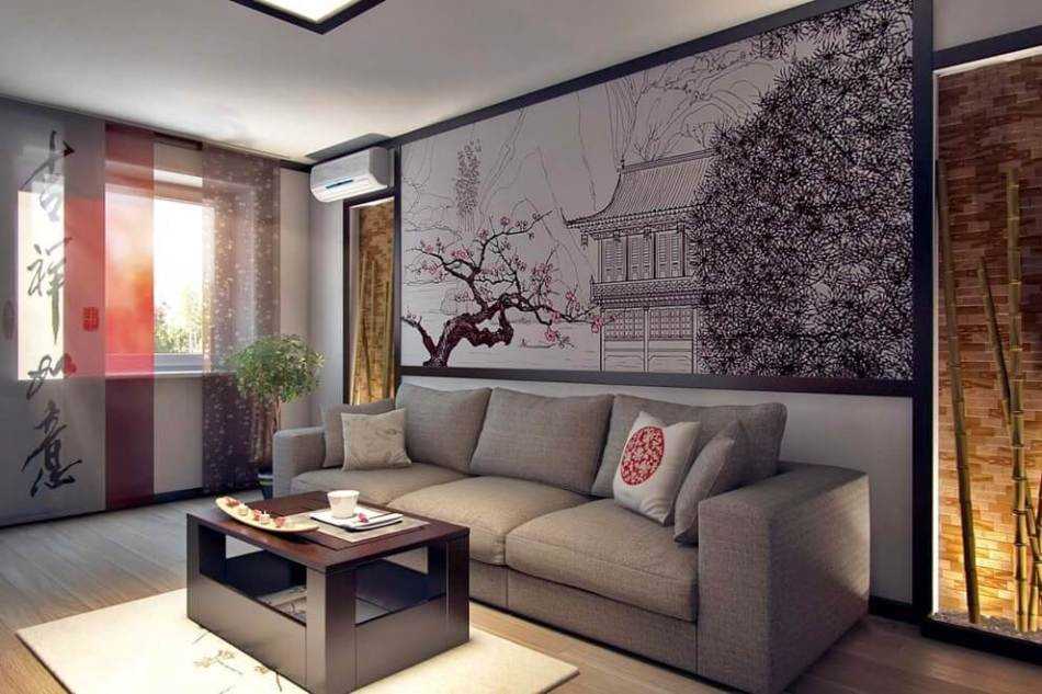 Интерьер гостиной в японском стиле обладает чертами минимализма. Мебель здесь не играет главной роли, поэтому используются только самые необходимые предметы. Отличительной ее особенностью являются низкие ножки, приземистость, геометризация.