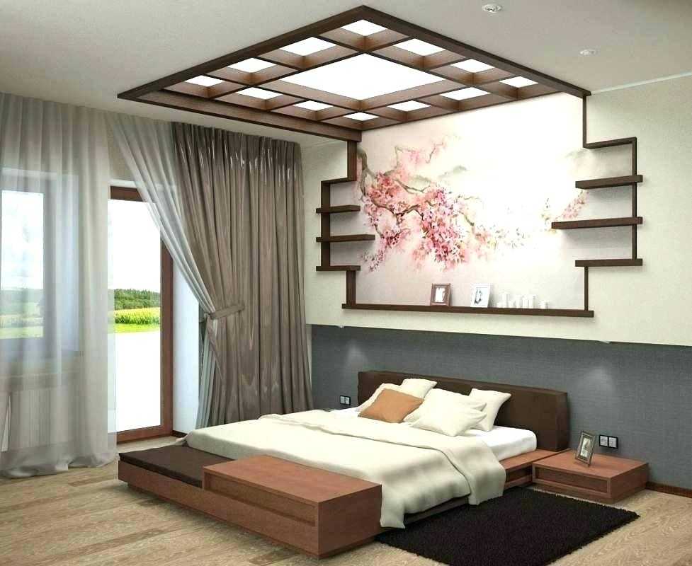 - Оформление потолка. В традиции жителей Японских островов для потолка подбирается краска в тон стеновому покрытию. Дизайнеры предлагают следующие варианты декора потолка в спальне: