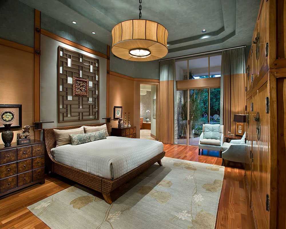 Интерьер спальни в японском стиле должен отличаться мягкостью и комфортом. Стены и потолок можно отделать в спокойных цветах: бежевый или песочный тон. Для освещения используются бра, торшер или точечный светильник.