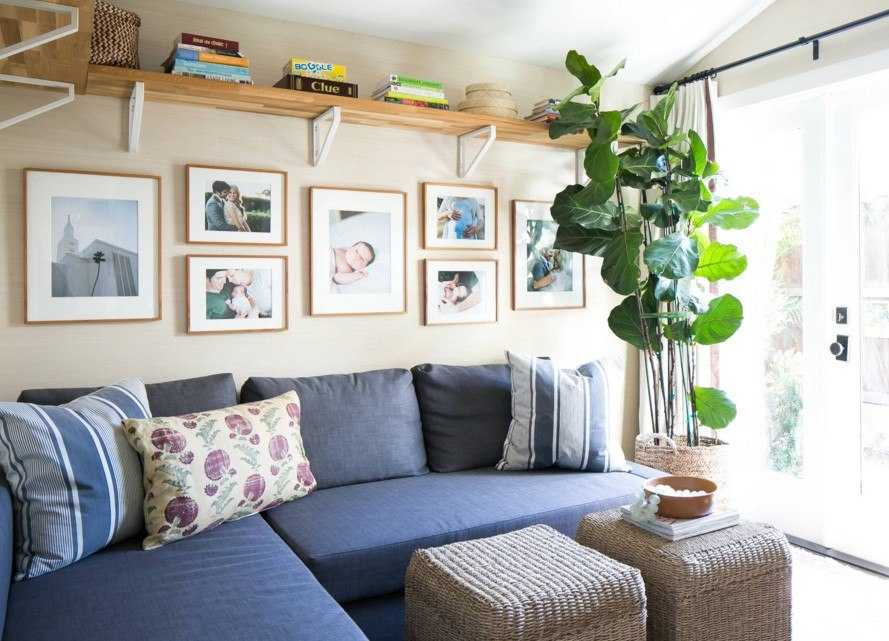 - При маленькой площади нельзя использовать крупные элементы декора (напольные вазы, статуэтки и т.д.), лучше заполнить квадратные метры мебелью, а в качестве декора использовать небольшие предметы, размещенные на полках, либо настенные картины.