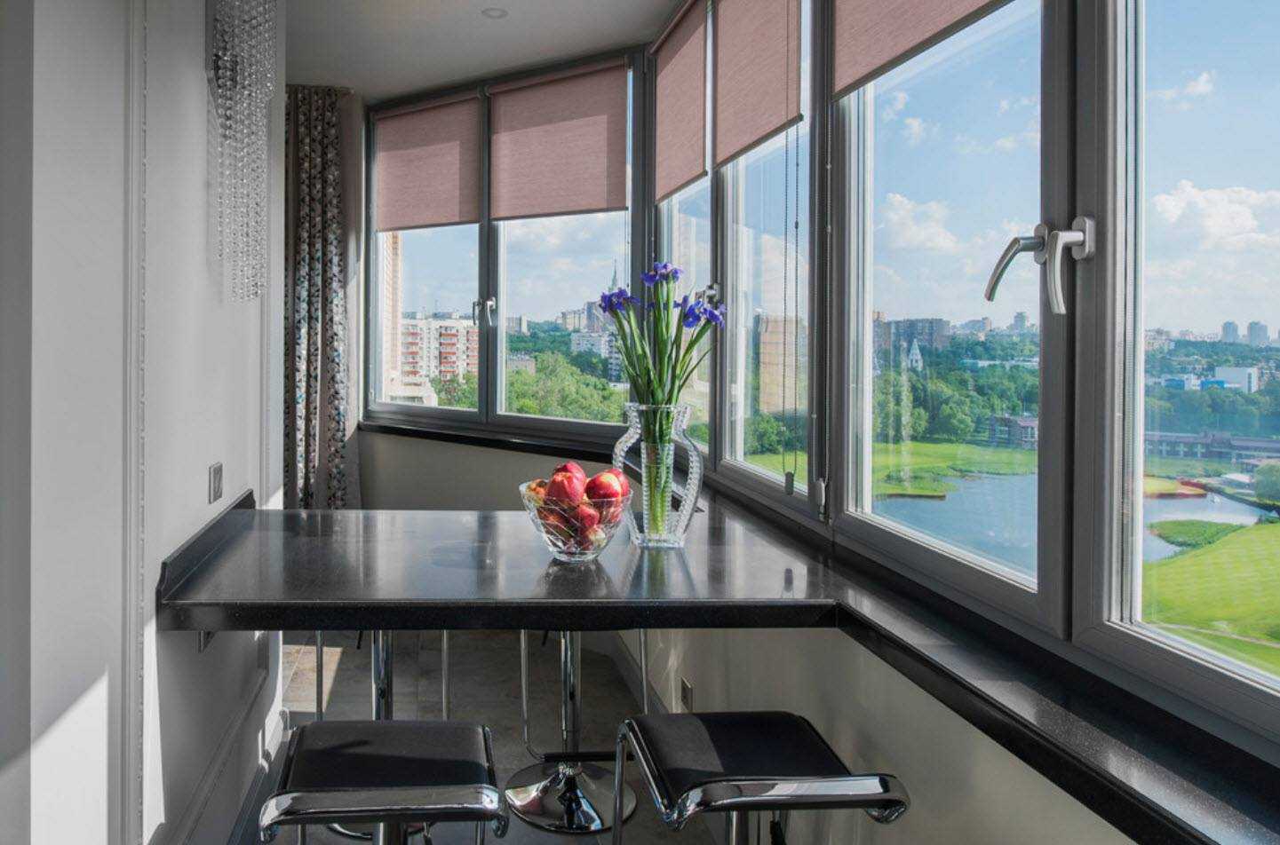 Завершается остекление занавесами и подоконниками. В продолговатых балконах с большим объемом створок выгодно использовать одноцветные шторы, раздвигающиеся за счет потолочного профильного карниза. Небольшим конструкциям подходят горизонтальные жалюзи или рольставни.