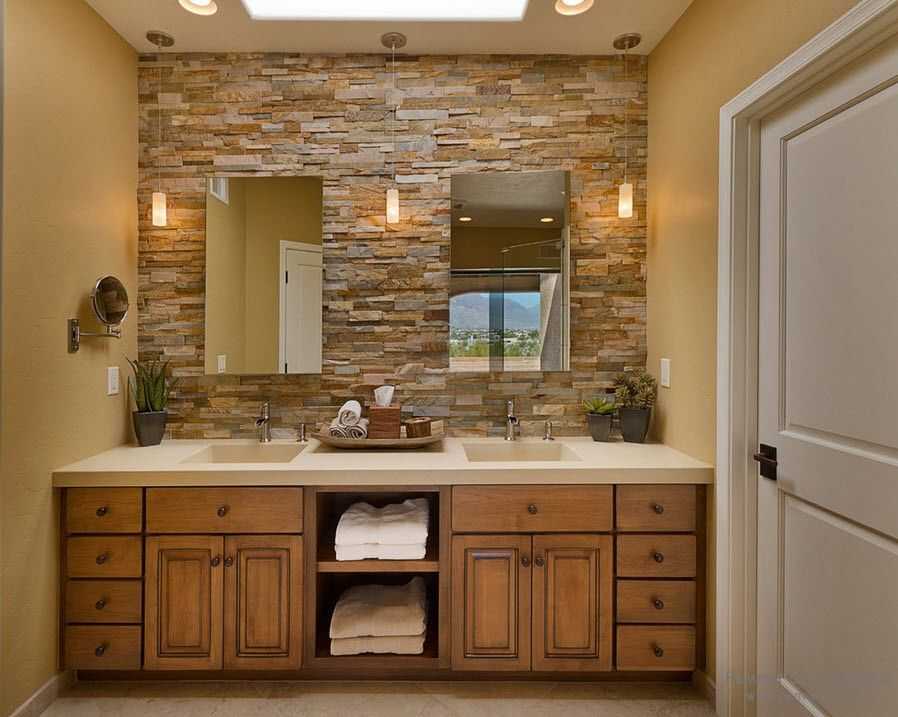 Вместо керамической плитки стены здесь стоит оклеить декоративным камнем – ее имитацией. Поскольку ванные, как правило, довольно маленькие, выбирают светлые оттенки и устанавливают светильники вверху, внизу и посередине, чтобы комната не казалась склепом.