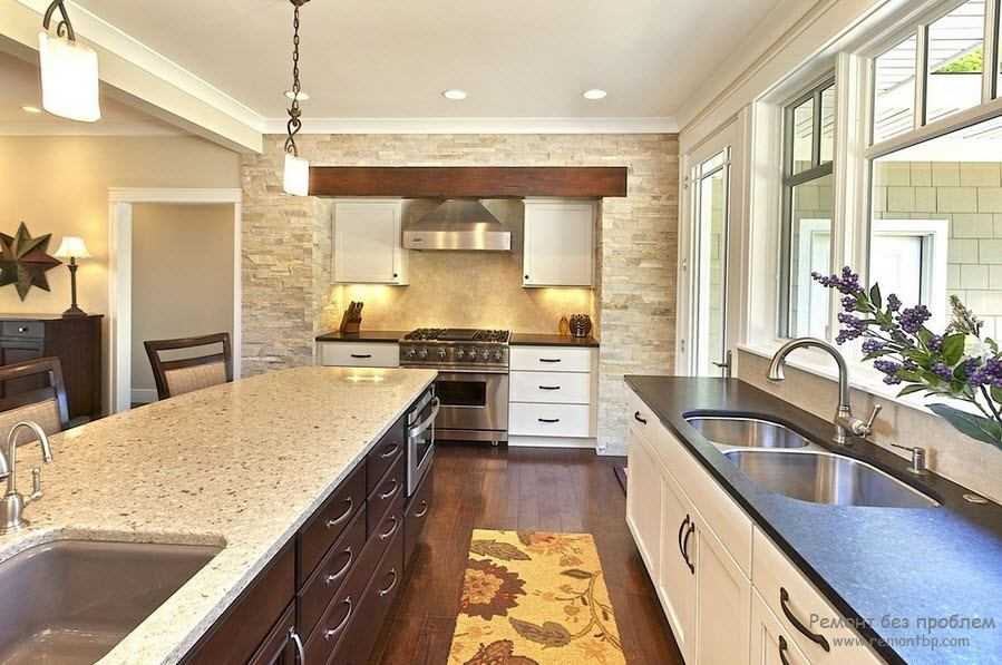Для фартука подходит «мелкая галька» или керамогранит под мраморные плитки. Интересно смотрится отделка стен под валуны, сочетаемая с деревянной или оштукатуренной облицовкой. Если по периметру окна наклеить гипсовые накладки, похожие на ставни, оно зрительно увеличится.