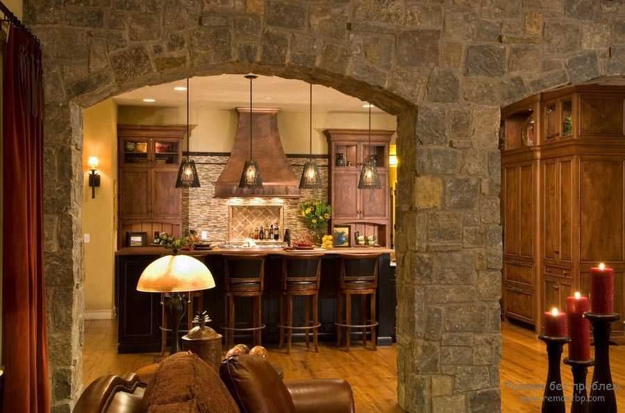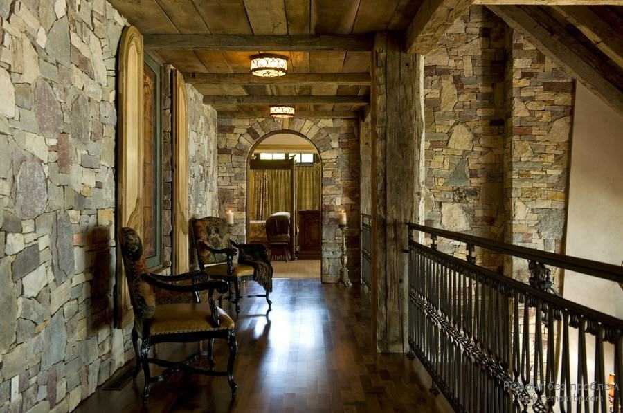 Для придания интерьеру веяния старины рекомендуется применить крупнозернистый камень для отделки арок, дверных проемов и каминов.
