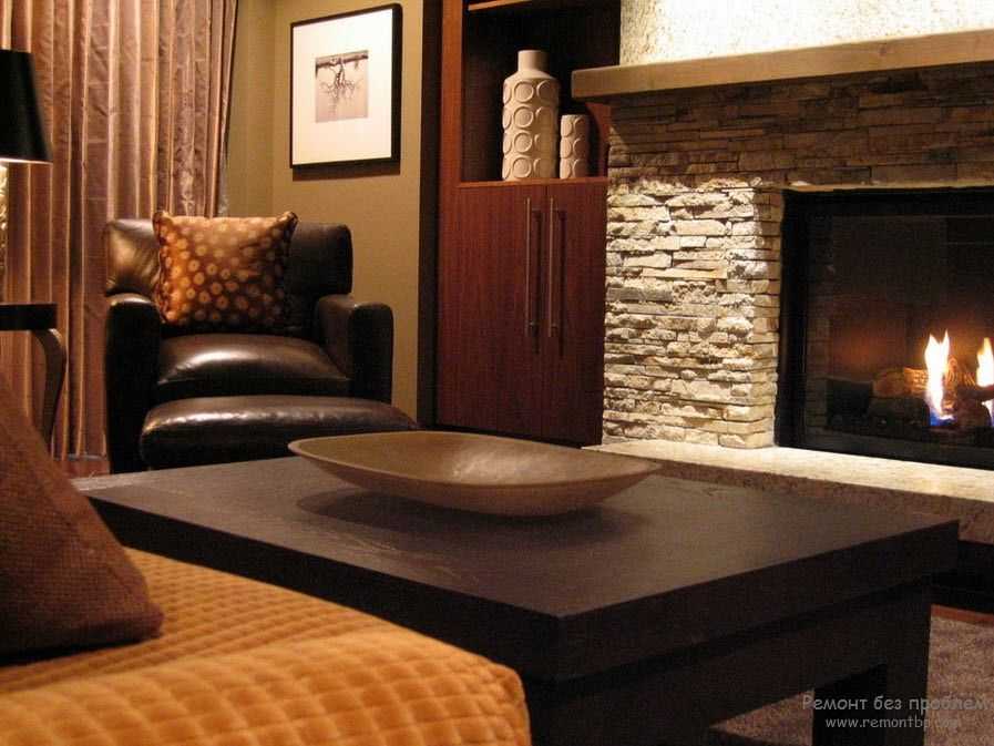 Каменная кладка в зале используется как облицовочный материал или для выделения зон. С помощью камня подчёркивается красота мягкой мебели, выделяется зона с телевизором или аквариумом. Модный вариант – выделение декоративным камнем стены с камином.