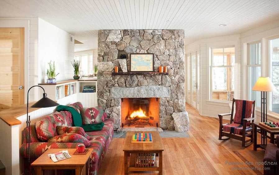 Валуны, галька и дикий камень в оформлении портала традиционного камина