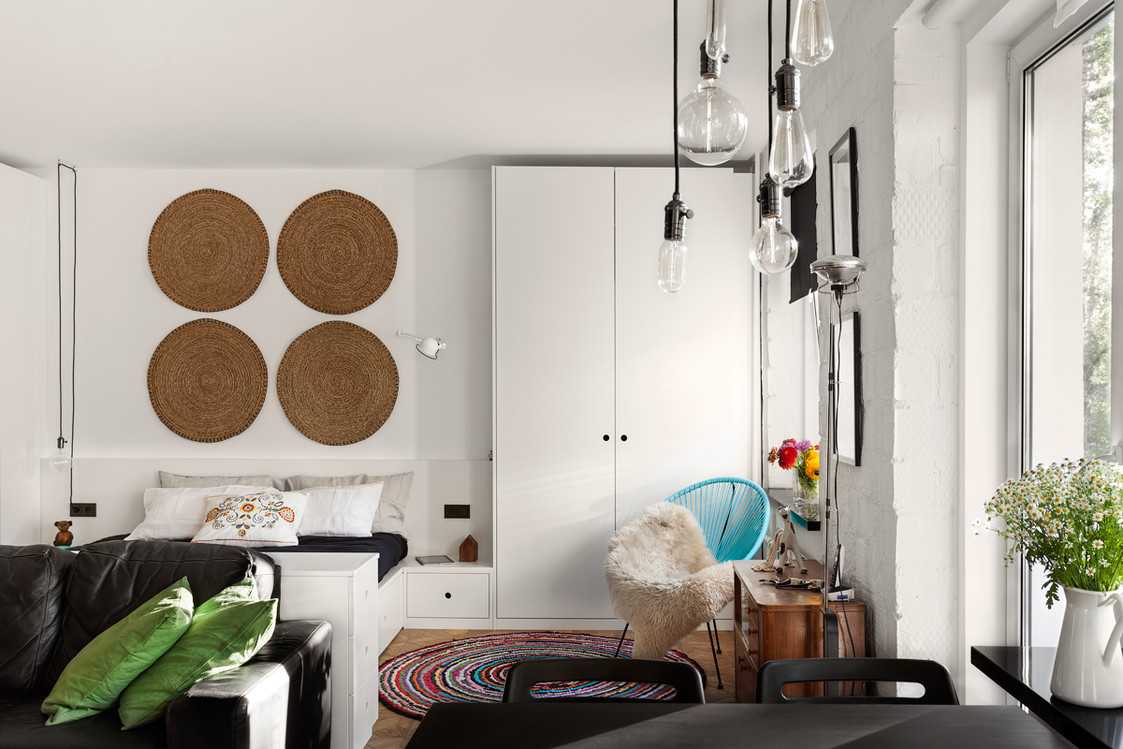 Отказаться стоит от тяжелого текстиля, громоздких рамок и прочих ярких и крупны украшений: они будут не только занимать излишне много пространства, но и оттягивать на себя взгляд, внося дисбаланс в интерьер. Интересные идеи для декора студии можно увидеть на фотографиях ниже.