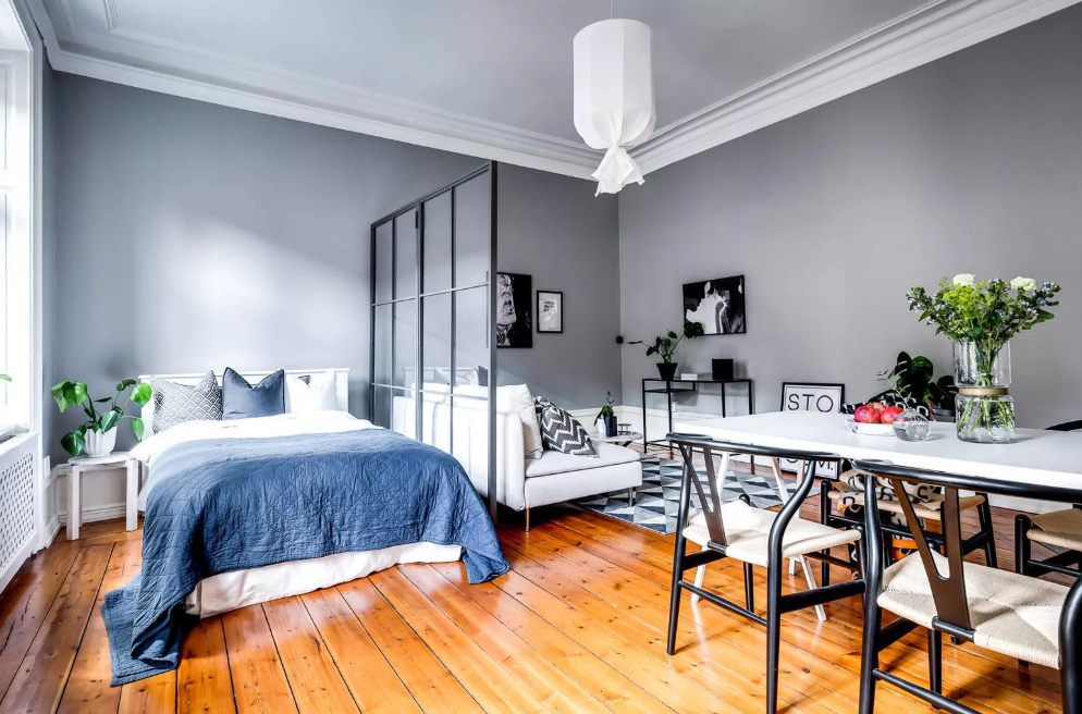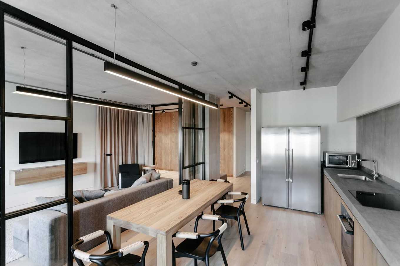Применение перегородок из стекла, которые могут изящно обрамляться посредством черных металлических рамок, а также раздвижных дверей, частичных стен, не доходящих до потолка, способно добавить апартаментам простора, ощущения свободы.