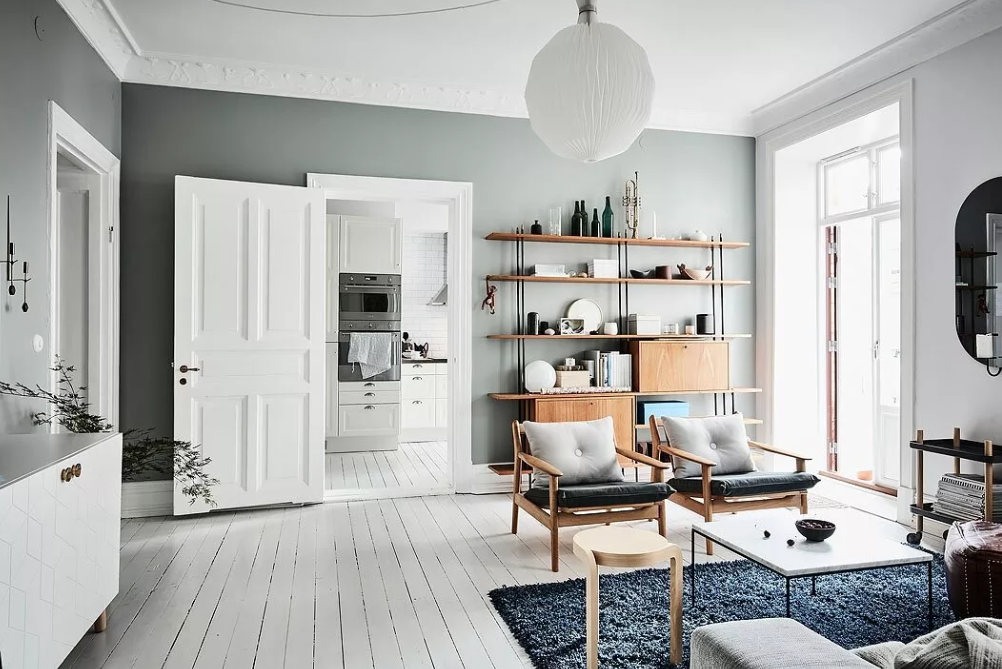 - Серо-зеленый. Включать в интерьер оттенки зеленого – тенденция 2021 года, которая продолжит быть актуальной. Серо-зеленый освежает и вдохновляет, на его фоне выгодно выделяется белая, голубая, бежевая мебель.
