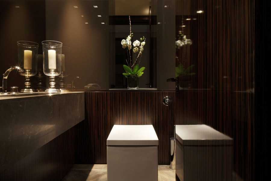 Знаковым отличием интерьера санузла в стиле арт-деко является унитаз или биде восьмигранной формы. Идеальным материалом для смесителей и душевого шланга считается нержавеющая или хромированная сталь.