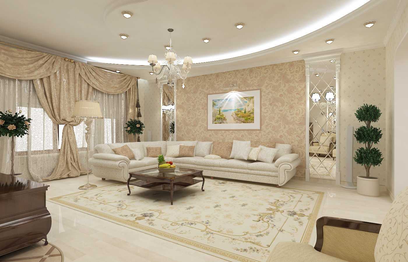 Помимо стандартного белого цвета, гостиную в классическом стиле выдерживают в нейтральных пудровых, голубых, розоватых или фисташковых тонах. Применяют бежевые, песочные и карамельные колеры, относящиеся к теплому спектру.