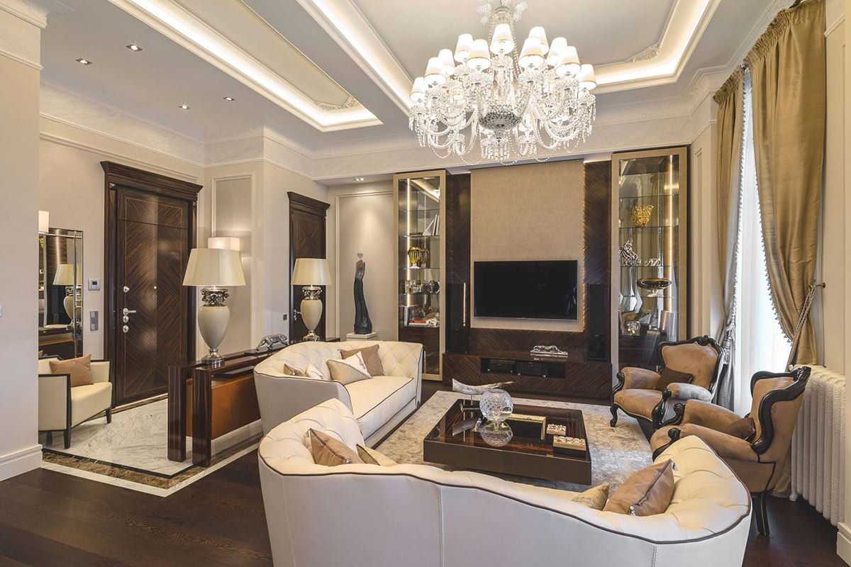 Дизайн квартиры в классическом стиле предусматривает использование только дорогих и роскошных материалов: натурального дерева, металла, позолоты, мрамора, как будто сошедших с музейных фото.