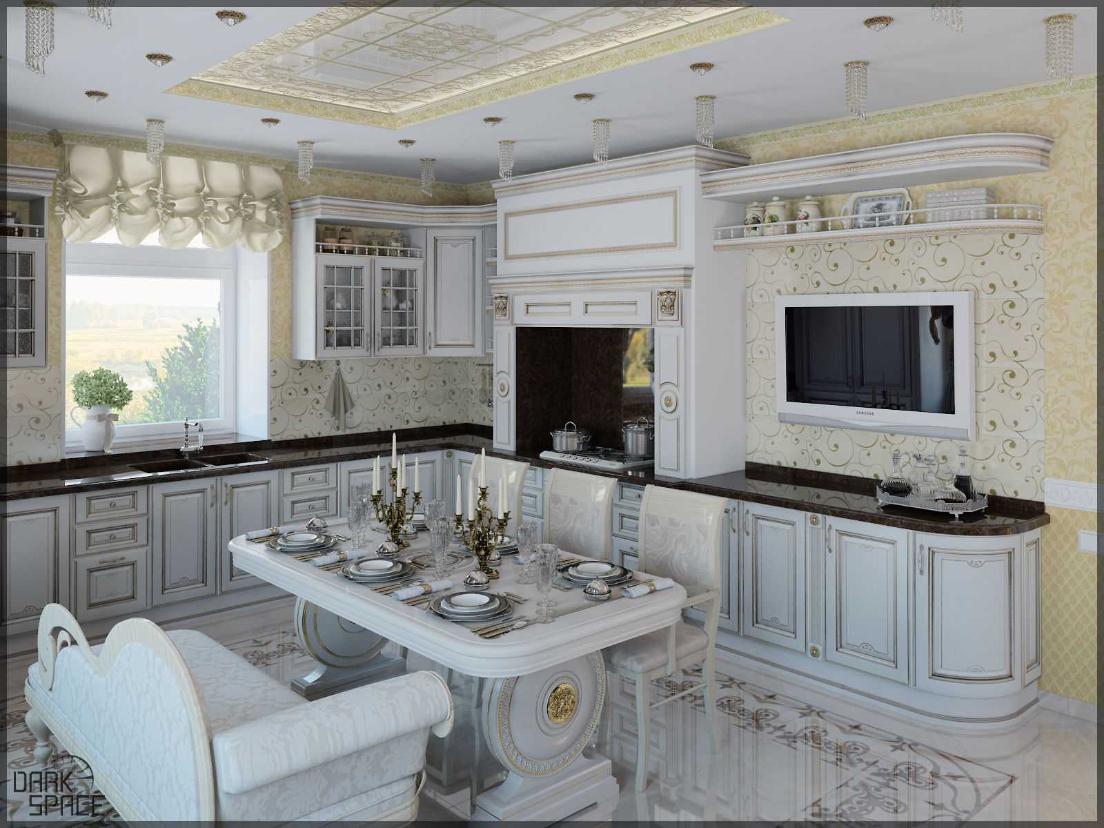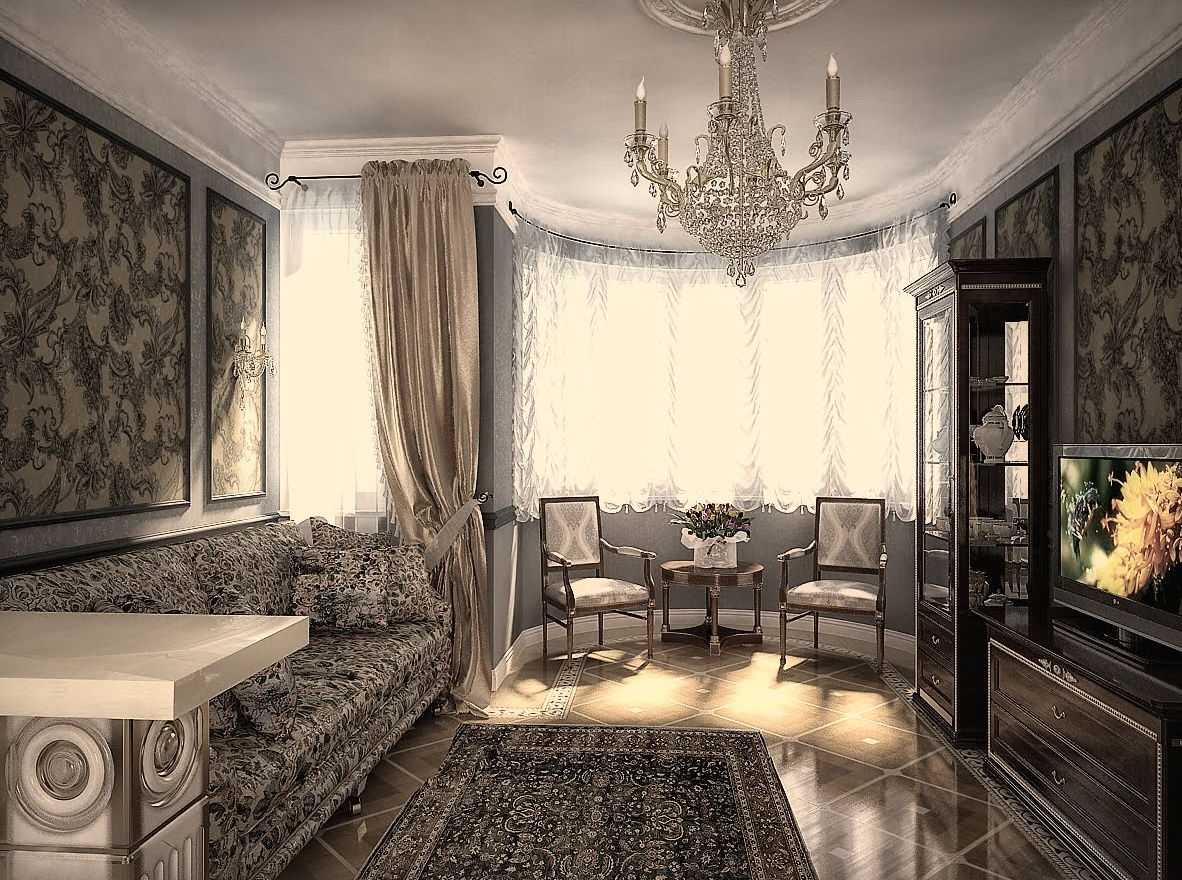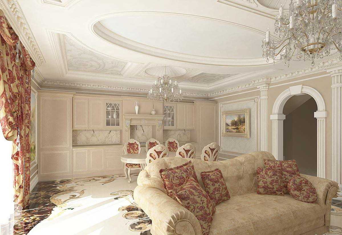 Потолок может быть украшен лепниной в виде рефренного цветочного орнамента с неяркой позолотой, традиционная классическая отделка пола – натуральный паркет. В планировке таких комнат используются арки, строгие многоуровневые конструкции потолков, особого уюта добавит камин, который станет центром всей композиции.