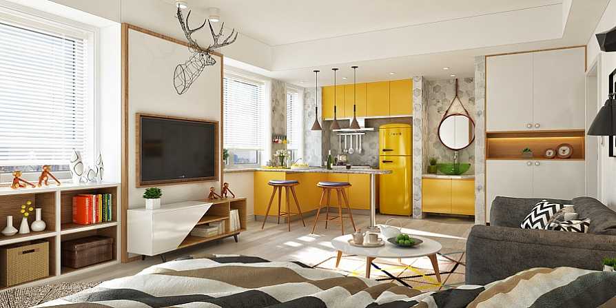 В зоне кухни можно сделать барную стойку и оставить окно открытым. Гарнитур выбирайте в светлых тонах, как и отделку всей квартиры.