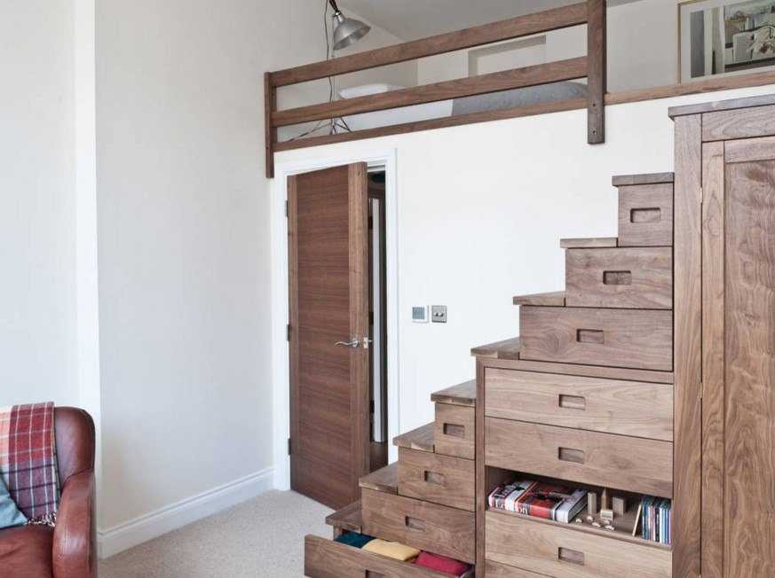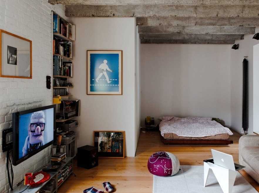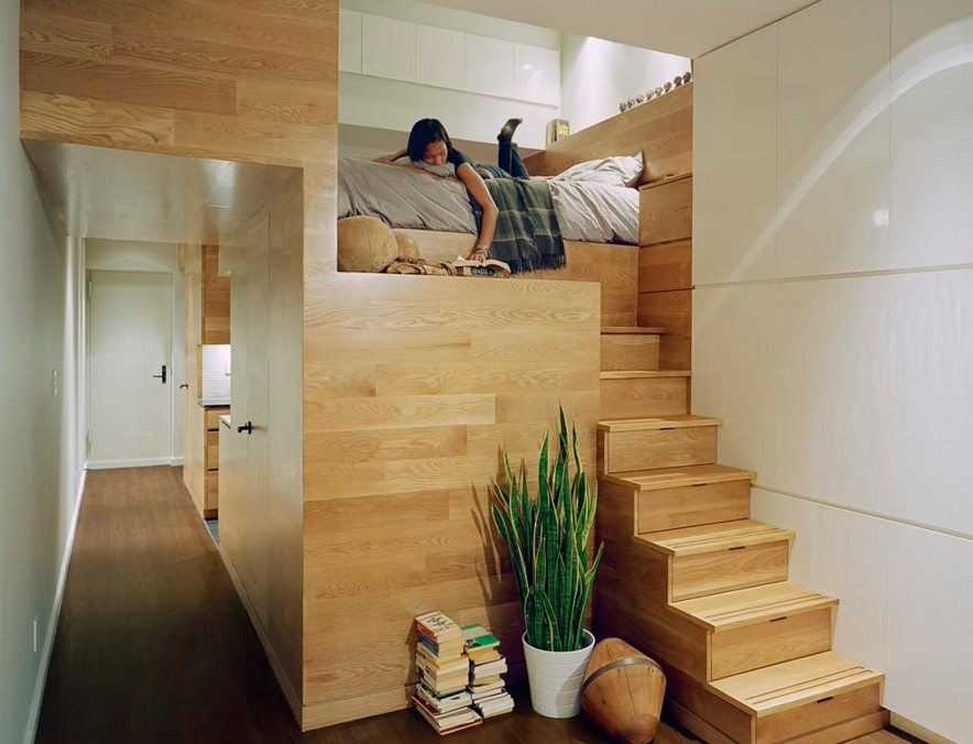 Независимо от площади жилища, в первую очередь продумывается система хранения вещей. Это может быть оборудованный подиум, где сверху устанавливается кровать или стол, а внутри прячутся постельные или другие принадлежности.