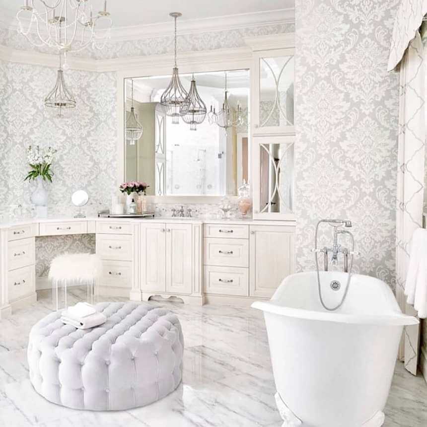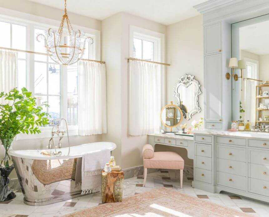 Ванная в этом стиле дышит уютом и ненавязчивой роскошью. Нейтральные оттенки дорогих материалов – мрамора, полированного камня и мозаичной плитки – позволят расслабиться после тяжелого дня и создадут атмосферу комфорта и безмятежности. Потолок можно оставить гладким, либо, если позволяет его высота, установить на него лепные конструкции или розетки. Позолоченные детали в стиле барокко или ампир – сантехника, держатели для полотенец, стаканчики и прочая утварь, – плавно изгибающиеся линии и белоснежно-белая керамика продолжат «дворцовую» тему.