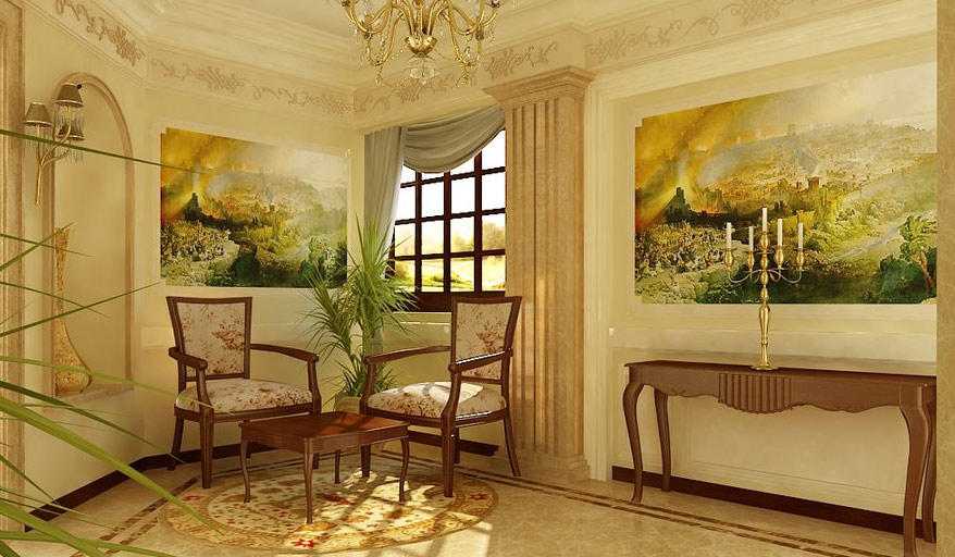 Гостиная. Выигрышный вариант фрески для гостиной — пейзаж. Любой тематика. Особенность такого изображения в том, что помещение становится более просторным и свободным.