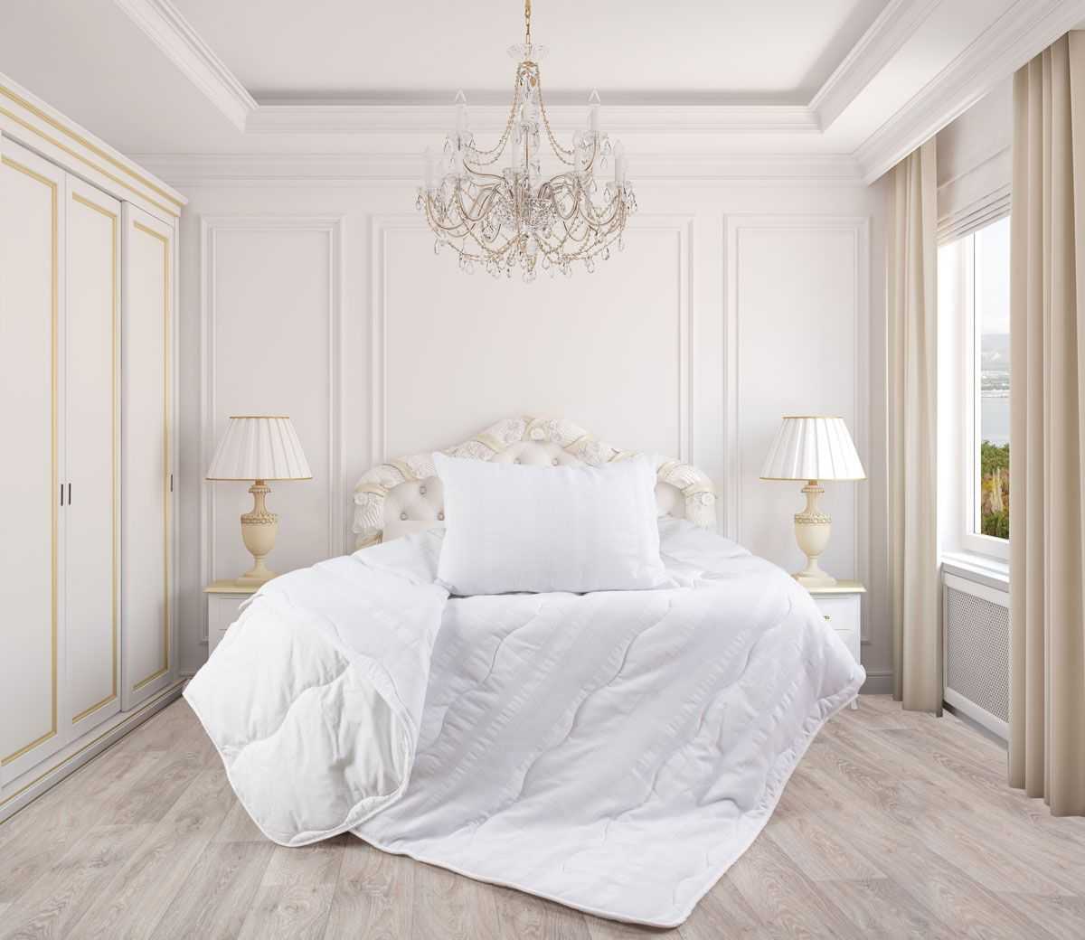 Светлое постельное белье и плед. Согласитесь, что, если вся спальня будет выполнена в светлых темных тонах, а посреди комнаты черным пятном будет стоять кровать с темным постельным бельем, это будет выглядеть крайне неуместно. Поэтому все должно сочетаться.