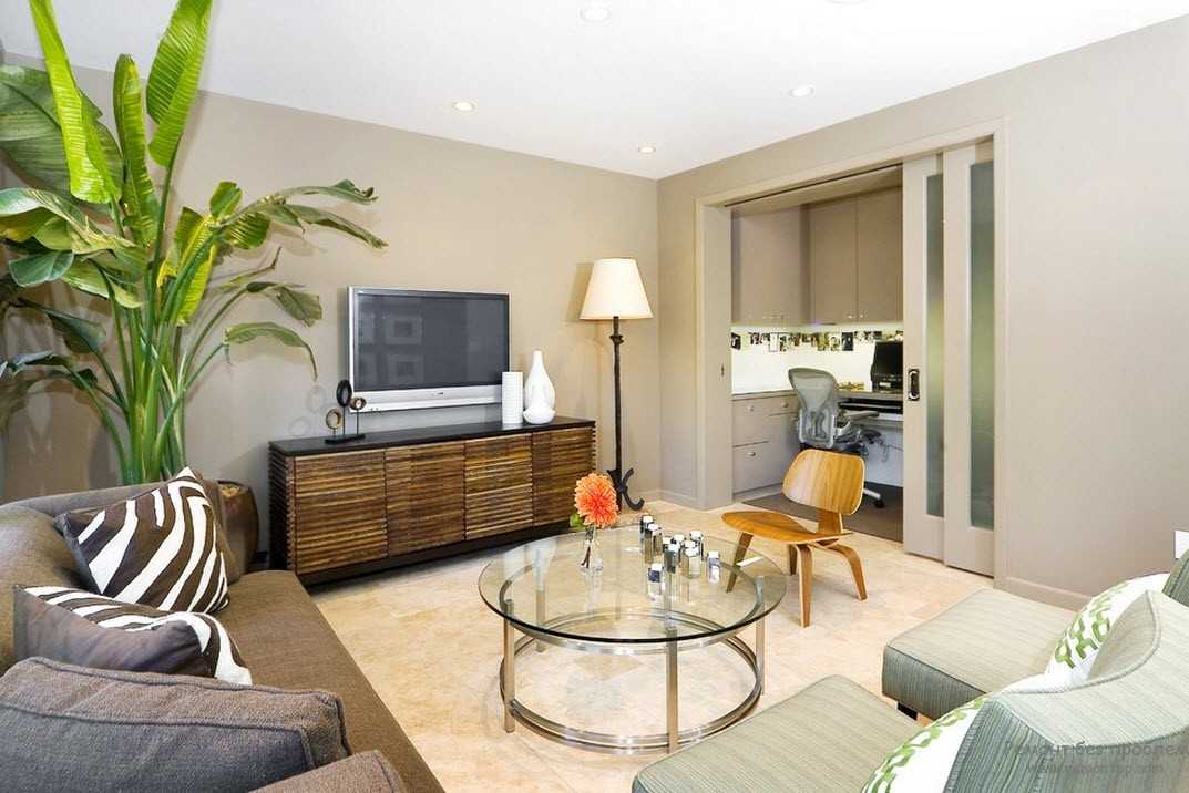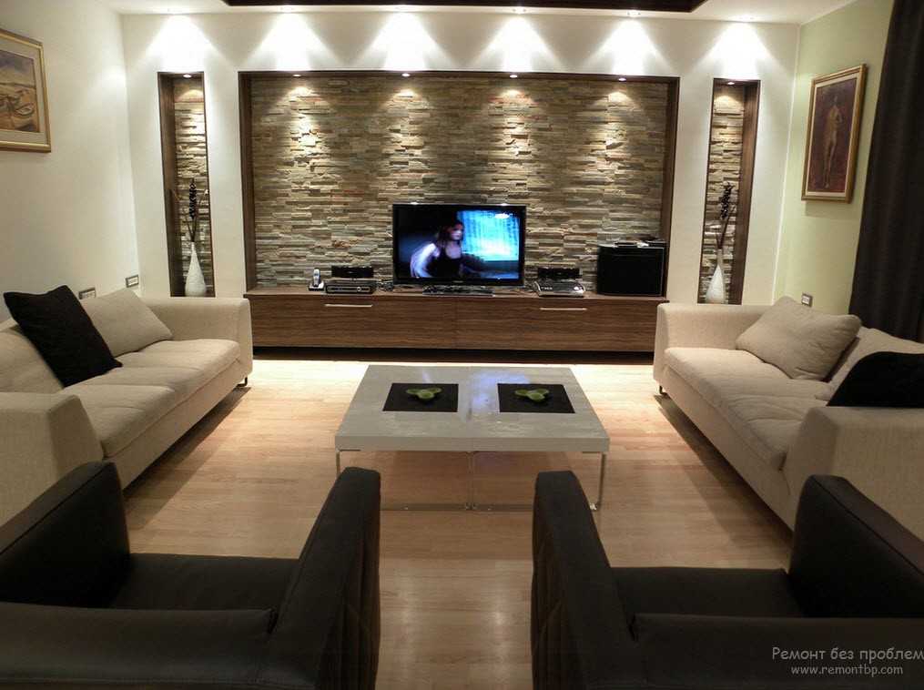 Поэтому для начала необходимо определить смысловой центр помещения и выделить его. Обычно этим центром является телевизор, вокруг которого размещается остальная мебель. Кстати, из всей бытовой техники, телевизор занимает самое главное место, в связи с чем месторасположение для него следует подобрать подходящее и достойное. Во-первых, относительно дивана его место должно быть безопасным, чтобы не испортить зрение. А правильное расстояние вычисляется следующим образом: измеряется ширина экрана, и полученная цифра умножается на восемь.
