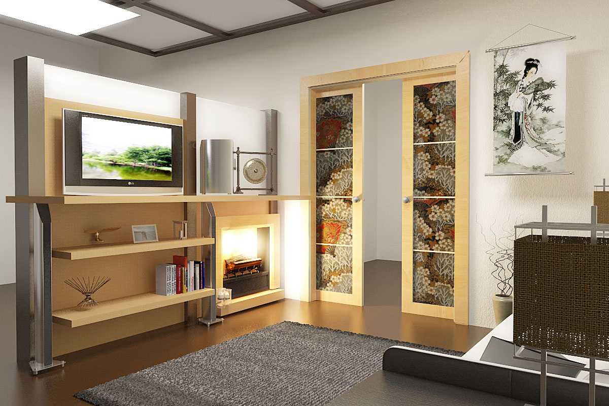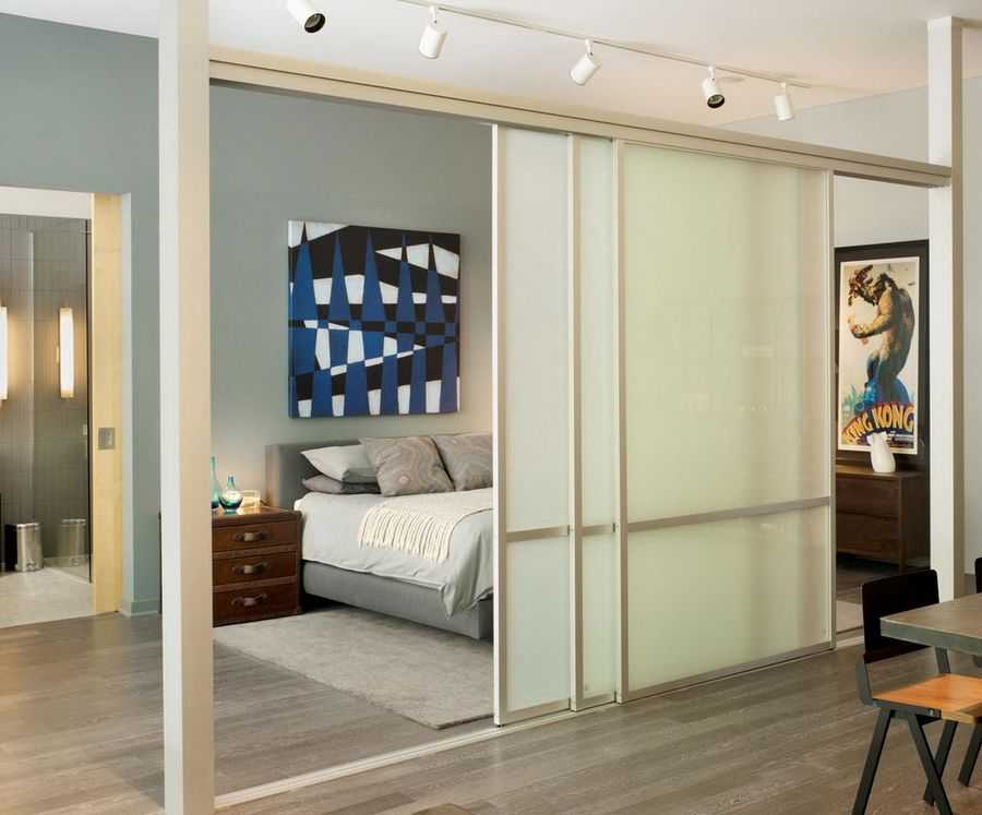 Довольно успешно с зонированием спальни-гостиной справляются раздвижные конструкции, которые устанавливаются на желаемый участок помещения. Таким образом создается азиатский стиль, образующий дополнительное визуальное пространство в комнате, разделяя ее на несколько частей. Очень выгодно использовать данный способ в крупных помещениях с малым количеством верхнего освещения. Подойдет установка стеклянных дверей в комбинации со шторами.