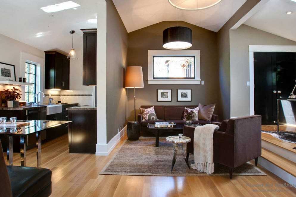 Но если вы истинный ценитель музыки и даже сами играете на музыкальном инструменте, то таким центром может стать пианино, рояль или же аудиосистема. Ну а способы разделения пространства могут быть различными: при помощи напольного покрытия, многоуровневого оформления потолка, разной отделки стен или же с помощью освещения. Например, неплохим вариантом будет расположить большую люстру над столом, а подсветку зоны отдыха произвести с помощью торшеров, дающих мягкий свет.