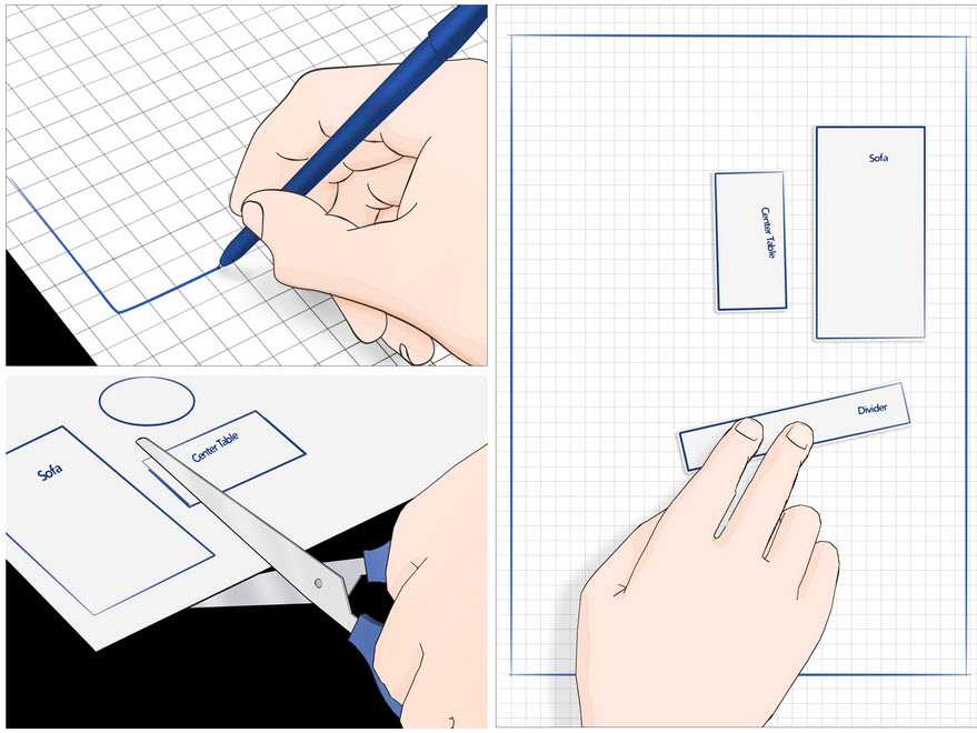 Первым делом измерьте длину и ширину вашей комнаты, а также всю мебель, которую планируете в ней разместить. После этого отобразите план на миллиметровке, приняв масштаб 1:3. Отдельно на листе бумаге нарисуйте предметы мебели, соблюдая пропорции, и аккуратно вырежьте каждый из них. Теперь вы можете свободно прикладывать бумажные макеты, пока не найдете наиболее приемлемый для себя вариант.