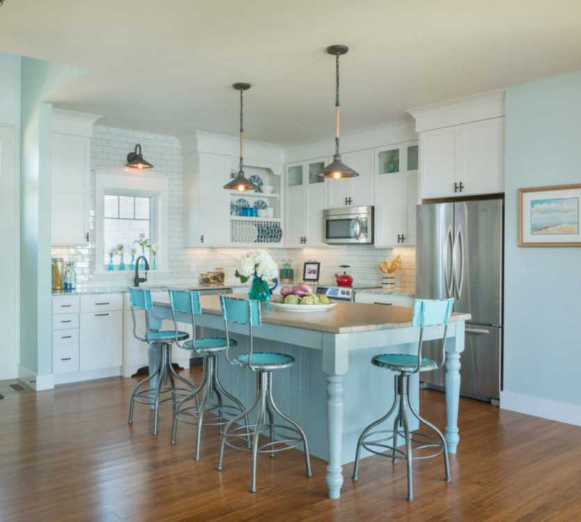 Глянцевый пол напитывает и отражает всю свободу и свежесть голубых стен