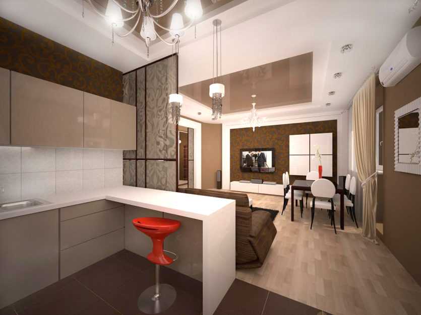 С помощью барной стойки также легко разделить зону гостиной-спальни и кухню. Для этого часто создаются гипсокартонные конструкции, из которых организуется стойка.