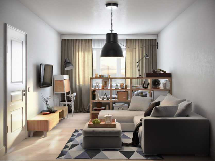 В просторной квартире-студии с двумя окнами легко создать капитальную стену, разделяющую две полноценные комнаты. В помещении прямоугольной формы уместно разделение с помощью гипсокартонных конструкций, которые могут быть сплошными или неполными, фигурными. В первом случае предполагается установка двери. Неполные перегородки представляют собой половину стены с фигурным краем. Такой вариант разделения универсален для любой квартиры-студии, уместен для разделения спальни и рабочей зоны на лоджии. При этом в гипсокартонной конструкции часто создаются ниши, делающие перегородку практичной и функциональной.