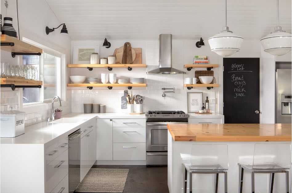 Навесные шкафы на кухне можно заменить широкими полками, что сделает кухню более легкой. Такой дизайнерский ход используют лишь в современных и ультрамодных квартирах, выполненных в стиле минимализма.