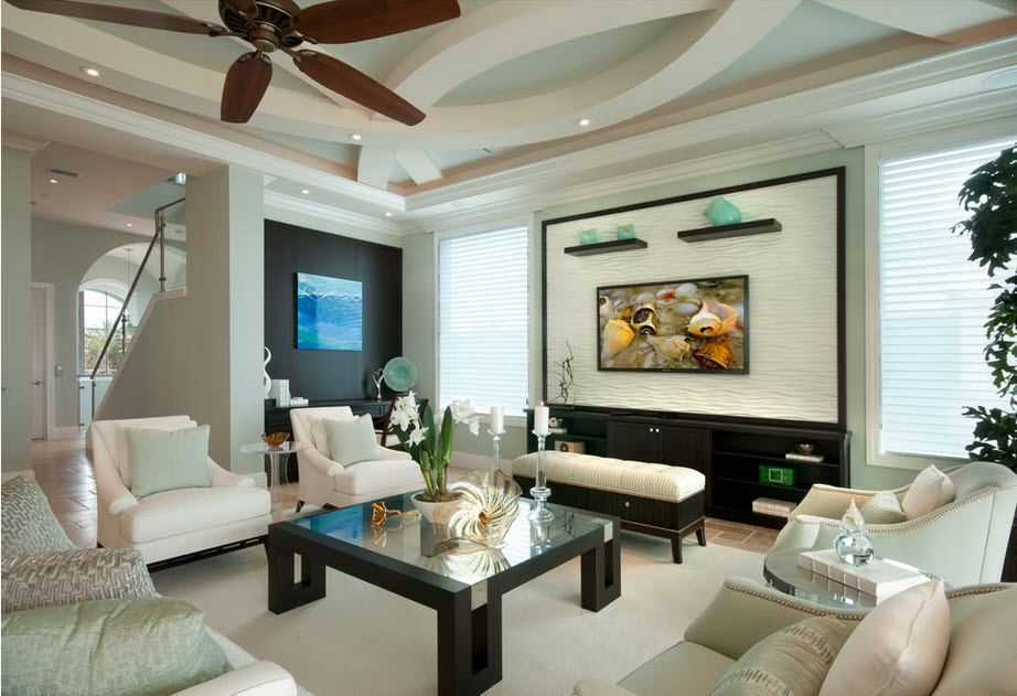 Одни из самых просторных помещений в доме или квартире обычно отводится на гостиную комнату. Именно поэтому потолки могут быть самыми разными и интересными. Если потолки в вашем помещении низкие – советуем остановится на классических вариантах покрытия. К примеру, можно выполнить окрашивание потолка с использование плавного градиента. Потолки, которые выполнены в венецианской технике с использованием штукатурки, выглядят эффектно и хорошо вписываются во многие стили, включая классический.