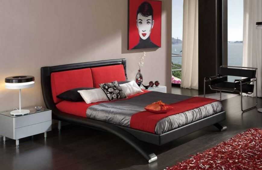 Под красные стены подойдет деревянная, кованная, черная, белая мебель, красный коврик, бордовый ламбрекен, нитяные шторы, красное или черное постельное.