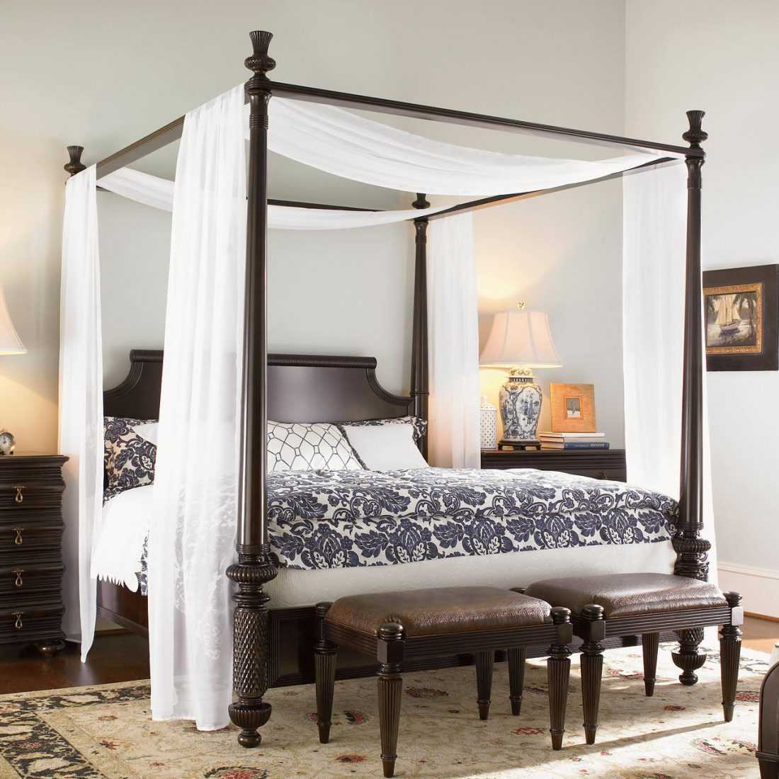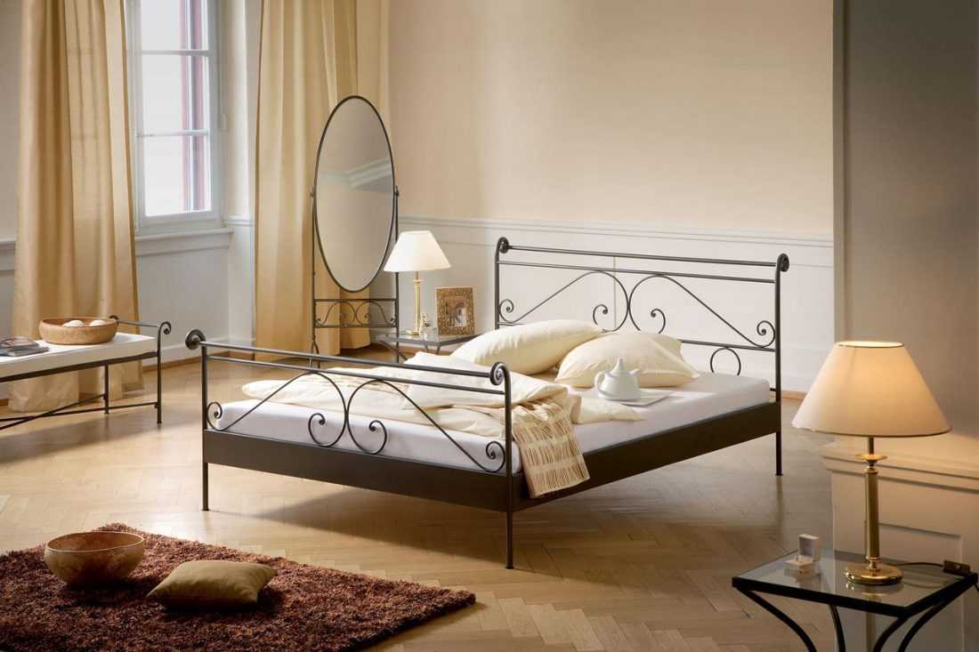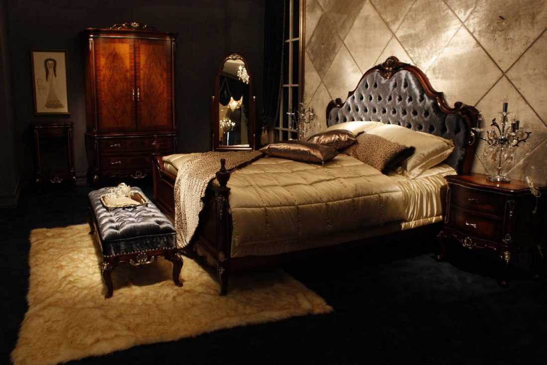 Дополнить кровать необходимо банкеткой в ногах. В том же стиле могут быть выполнены целые комплекты – трюмо, косметический столик, бюро, напольная вешалка-плечики. Такая мебель изготавливается из натурального массива, но может быть окрашена в пастельные или нейтральные тона. Для отделки в этом случае используют медь, бронзу, позолоту.