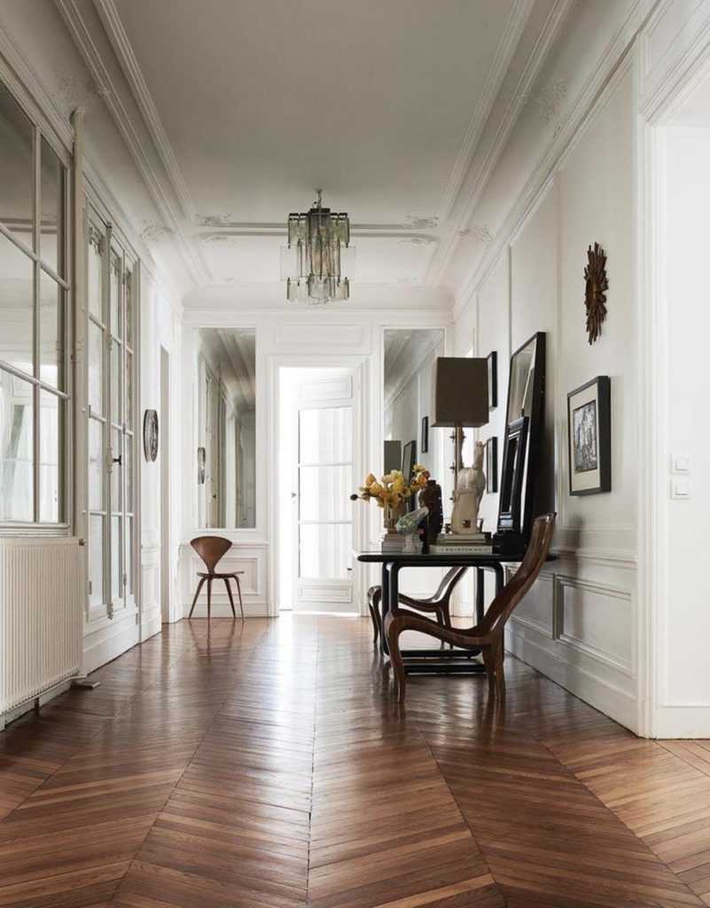 Доски из натурального сырья можно расположить таким образом, чтобы изменить пропорции интерьера. Гостиная в парижском стиле короткая и широкая? Расположите доски параллельно более длинной стене, чтобы сделать комнату длиннее. Если у вас есть проблемы с узким интерьером, выберите традиционную елочку, которая расширит пространство.