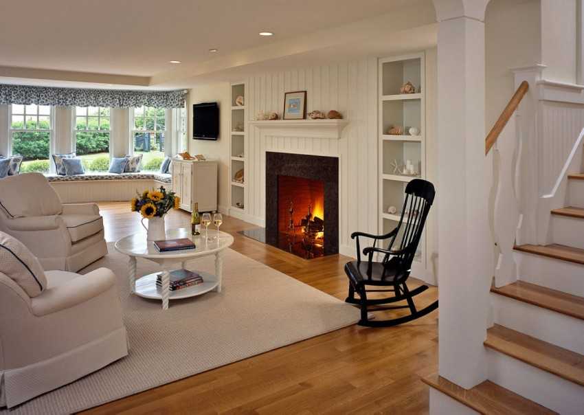 В интерьере гостиной кресло-качалку можно расположить перед телевизором, журнальным столиком или, по традиции, рядом с камином. Главное – чтобы дизайн кресла гармонировал с интерьером комнаты.