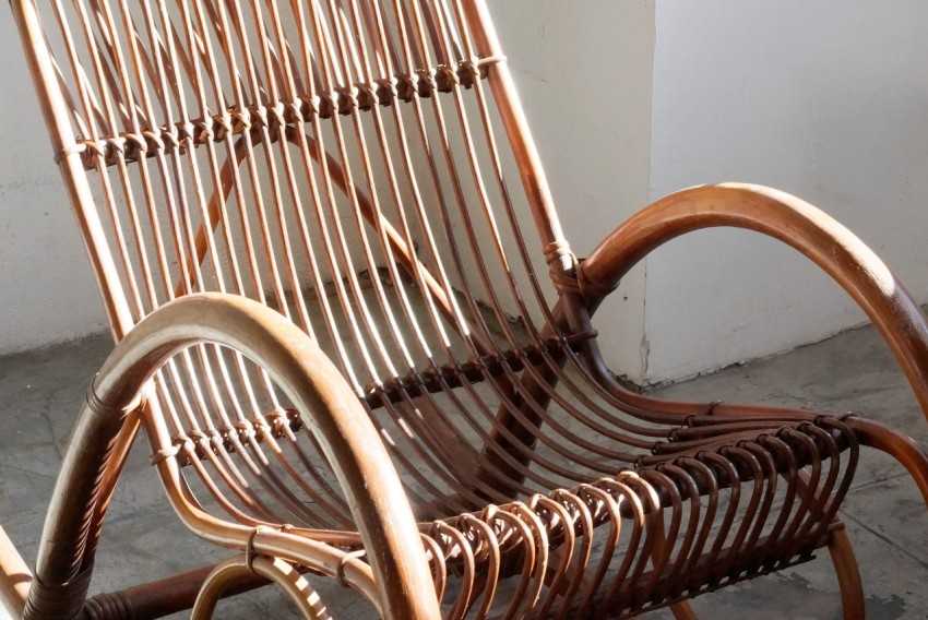 - Кресло-качалка из ротанга — гибкой лианы. Такое кресло-качалка классика современного дачного интерьера. Такой материал не позволяет использования креплений на шурупах и гвоздях, только клеевой контакт и вязка. Поэтому кресло-качалка из ротанга очень уступает классическому варианту из лозы. Однако, лиана боле прочна чем лоза, а поэтому лучше держит форму. Удобный вариант для использования вне дома, на веранде или балконе.
