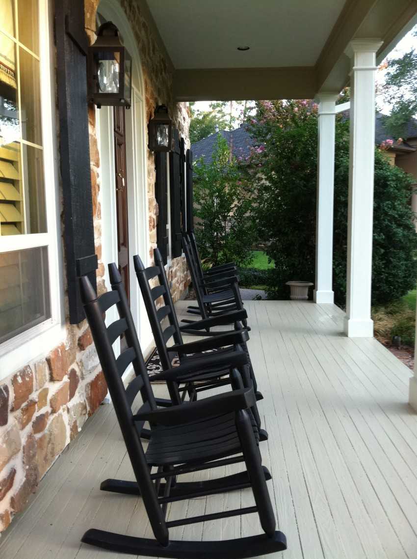 Кресло-качалка на террасе или просторном балконе смотрится очень гармонично. Для расположения под открытым небом обычно выбирают кресла, изготовленные из дерева или ротанга.