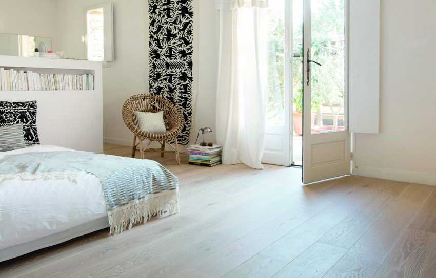Выбеленный ламинат стоит сочетать с мебелью и текстилем цветов, которые на несколько тонов темнее пола. Если все поверхности будут одинаково белыми, спальня станет похожей на медицинскую палату.