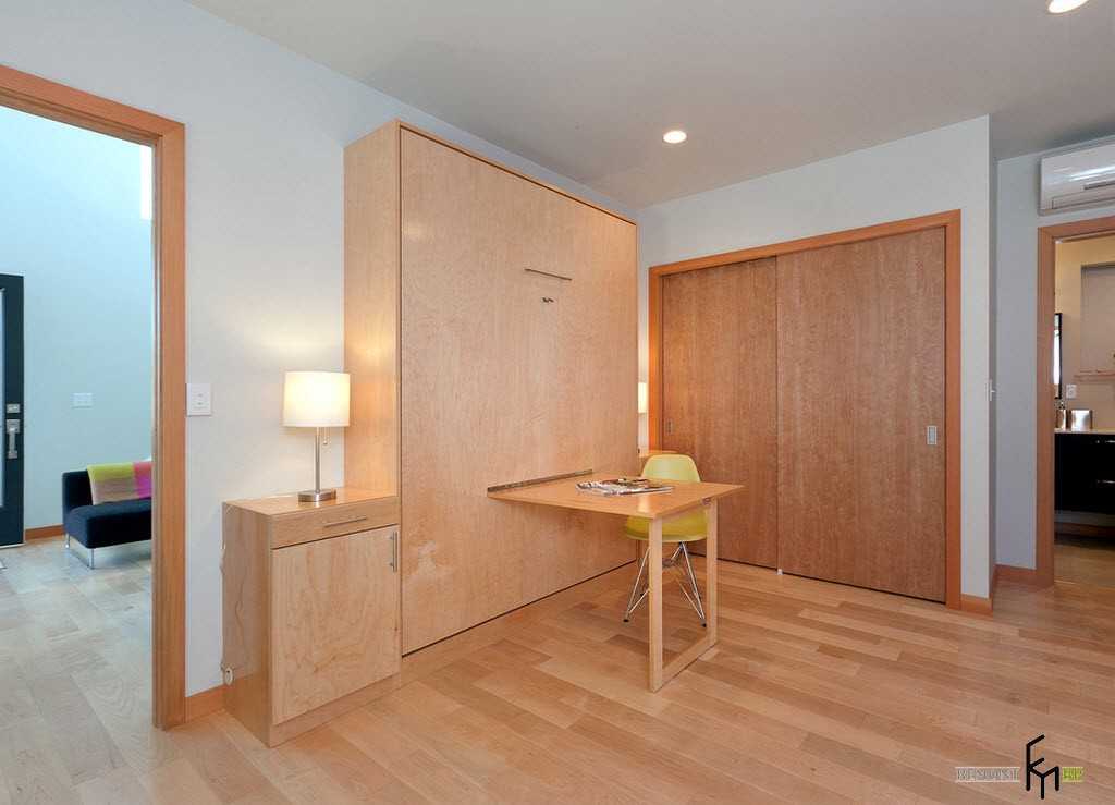 В спальне можно установить кровать, убирающуюся в шкаф после использования – это позволит сэкономить еще несколько метров свободного пространства. Тут есть несколько плюсов