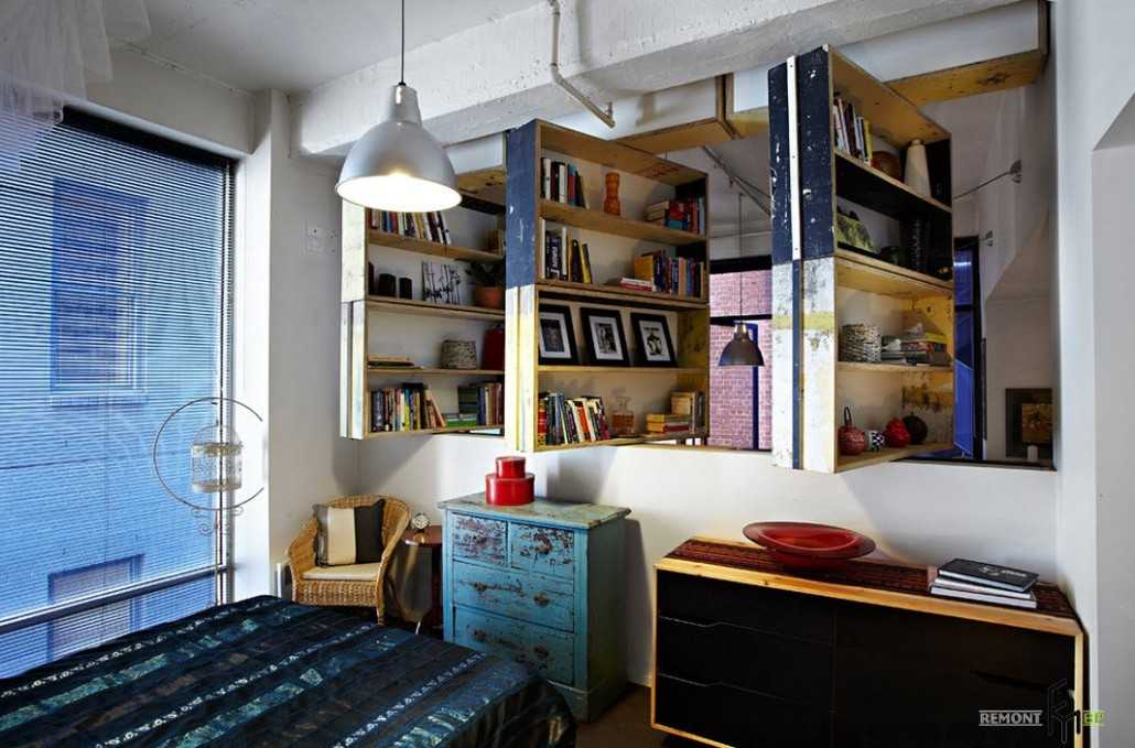 Спальное место будет компактным, что очень важно для ограниченного пространства. Шкаф будет одновременно выступать и как место хранения вещей