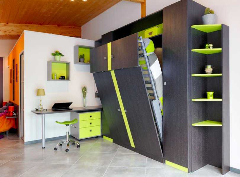 Интересны и практичны мебельные кострукторы для детских комнат. Трансформация кроватей в попутный функционал начинается со смены позиции и устремлен к конструктивному творчеству. Складывающийся механизм надежно прижмет спальное место к стене без претензий на метраж комнаты. Но есть более современная альтернатива, когда по направляющему профилю, она поднимается вверх согласно схеме движения лифта. Для узких комнат лучше ничего не придумать.