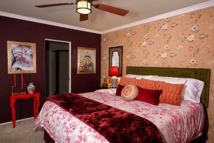 Соединение персикового и красного является классическим в восточном стиле. Это одно из самых удачных сочетаний. Если в него добавить глубокие коричневые и золотые тона, то обстановка засияет новыми яркими красками. Отлично подойдут оттенки карамели, дуба, шоколада или каштана. Комната получится одновременно яркой и теплой.