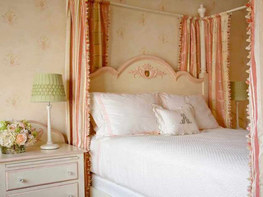 Если для спальной комнаты выбрана персиковая кровать, то гармоничней всего она будет смотреться на белой, нежно-васильковой или лавандовой стене.