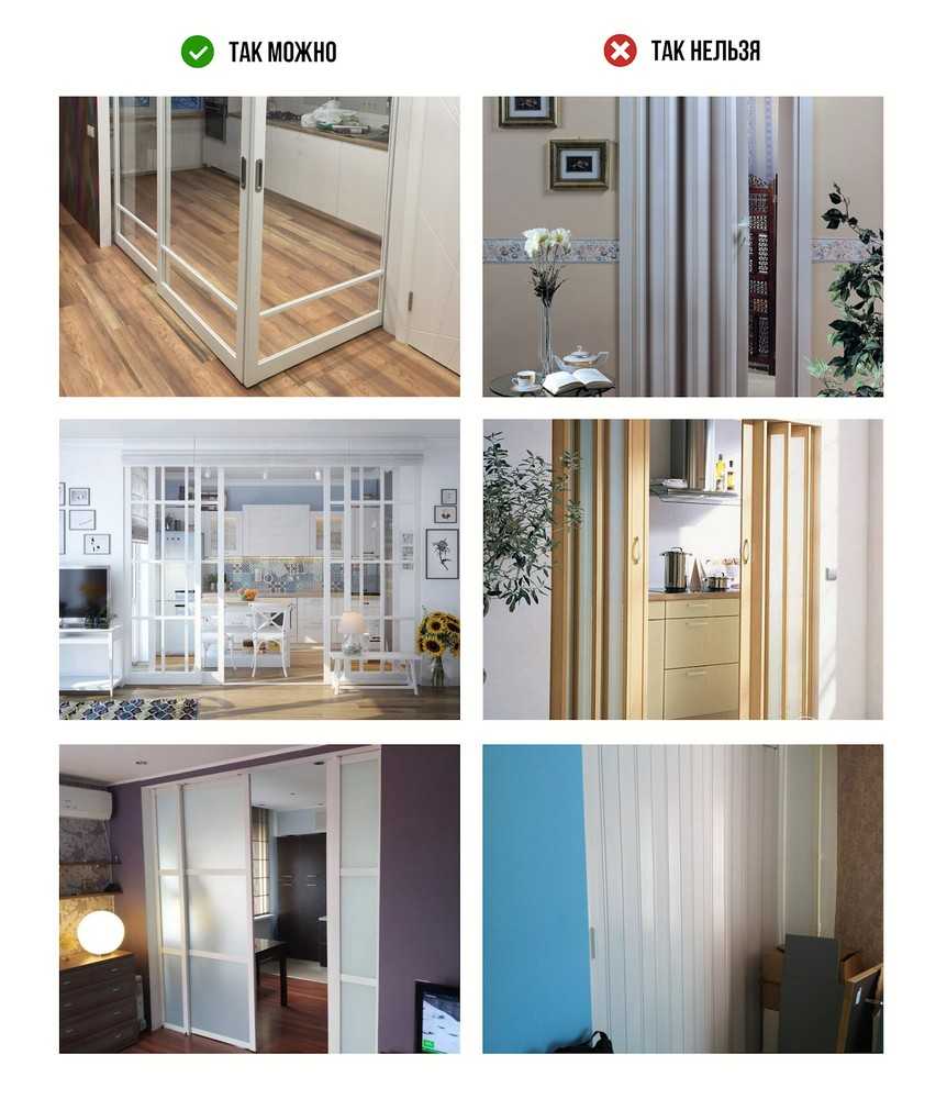 Пластиковые двери-гармошки ставить нельзя. Считается, что они не позволяет обеспечить изоляцию кухни от жилой зоны в случае утечки газа.